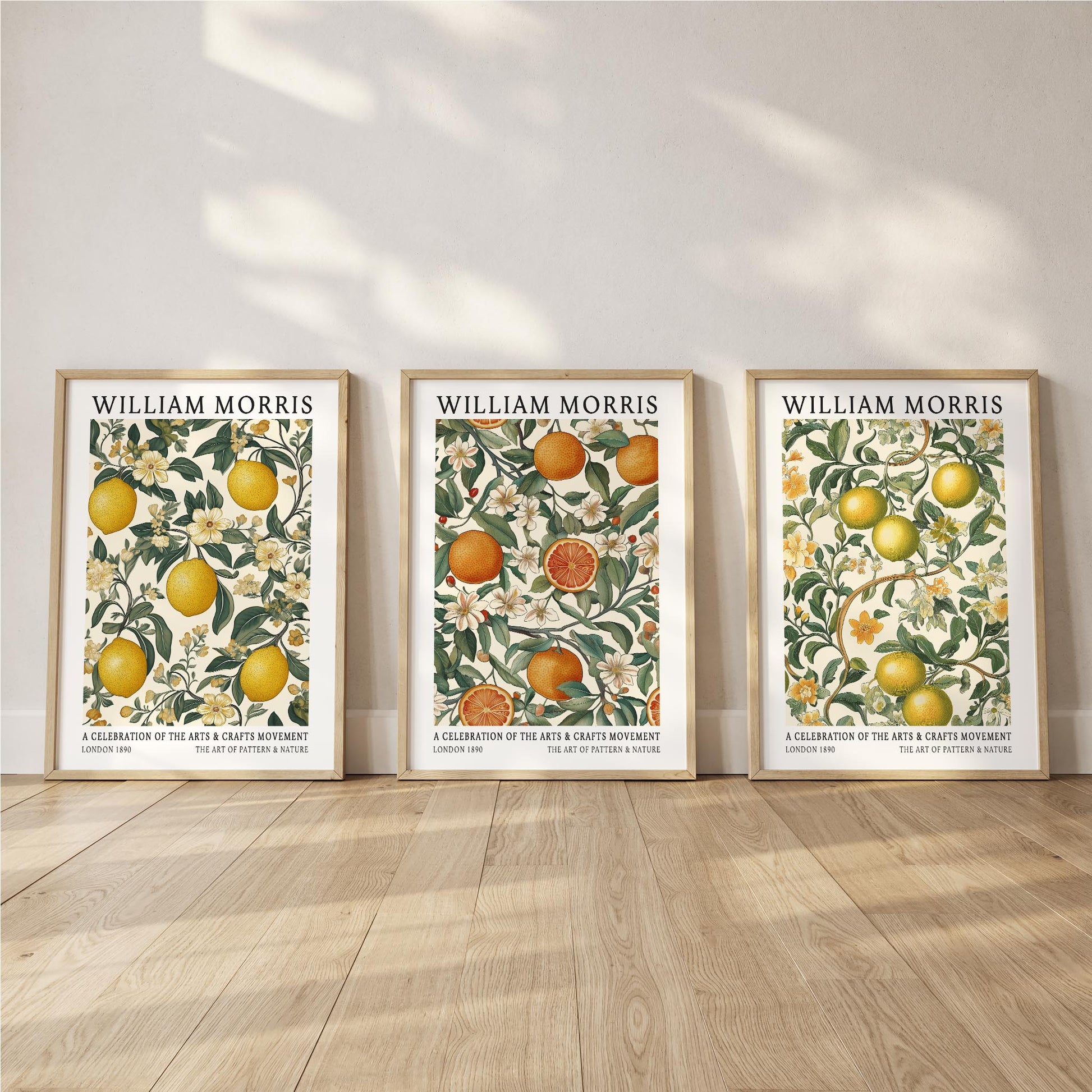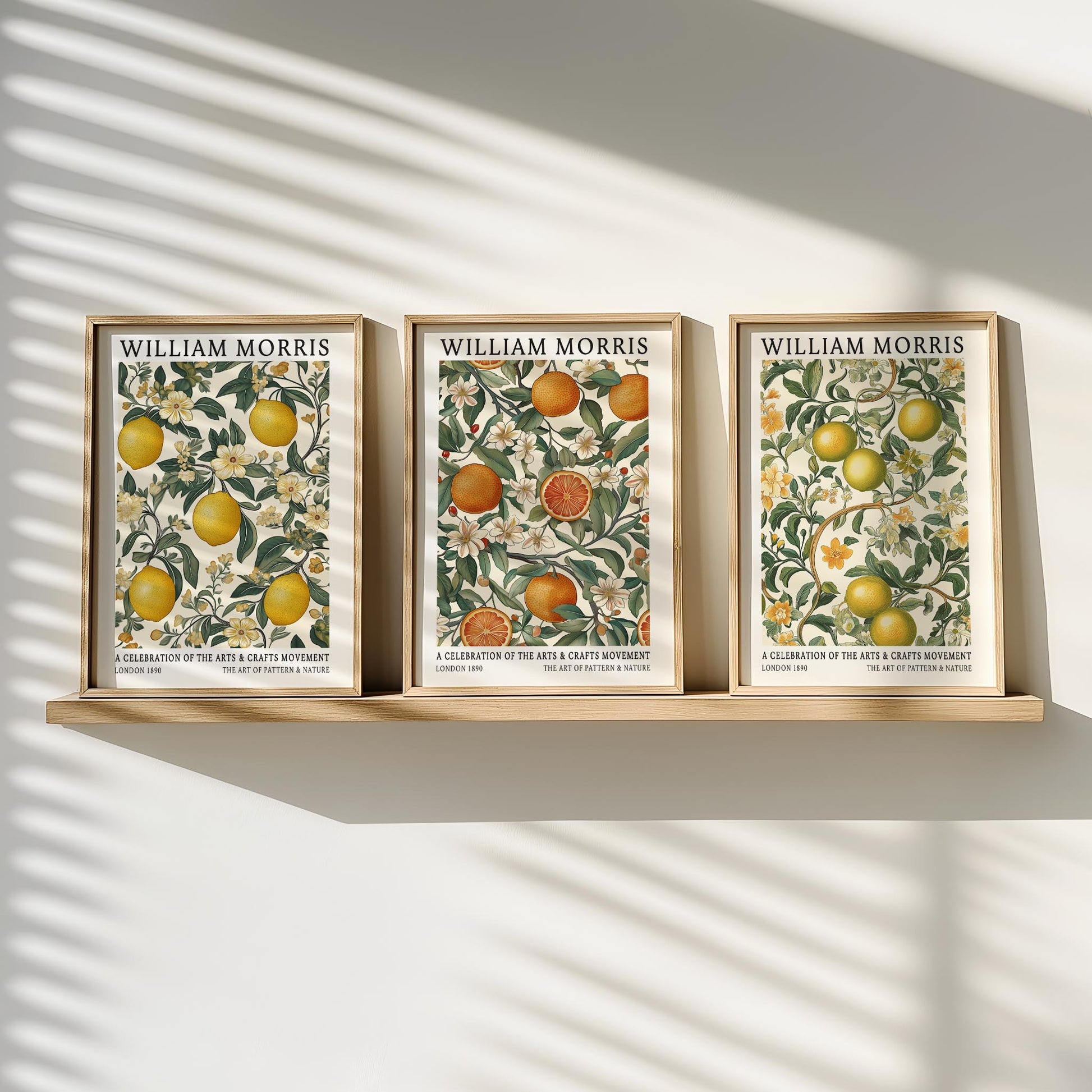 Complete your kitchen or dining room with this coordinated set of three William Morris style botanical prints. Featuring lemon, orange, and lime designs with delicate florals and rich green foliage, this Arts and Crafts inspired collection brings timeless English charm to your walls. Each print complements the others through a shared vintage aesthetic and natural colour palette, creating a cohesive gallery wall display perfect for kitchens, dining rooms, or any space that celebrates classic botanical art.