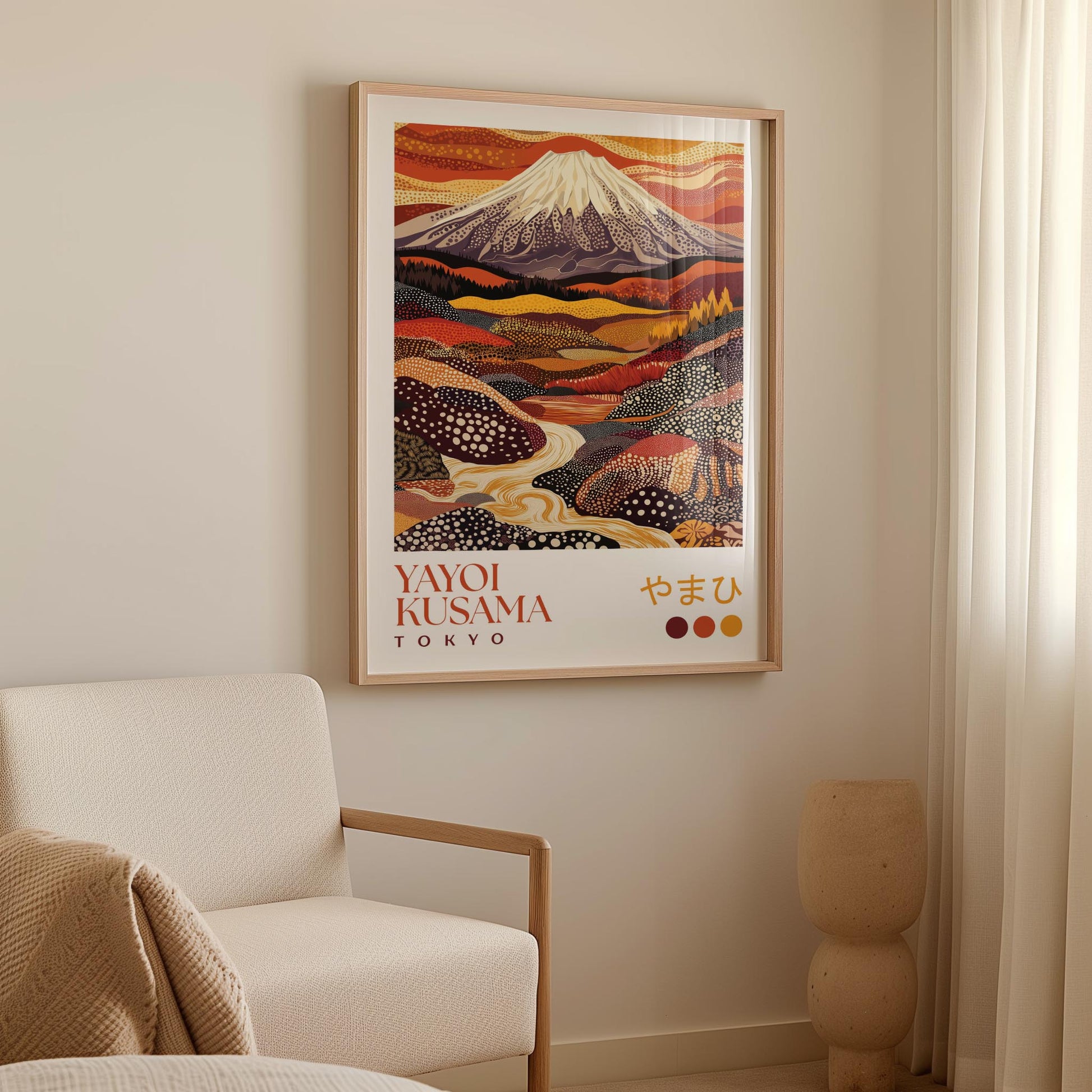 Striking Japanese wall art featuring Mount Fuji rising above a vibrant autumn landscape. This Yayoi Kusama inspired print transforms the iconic mountain scene with her signature polka dot patterns across rolling hills of burnt orange, deep burgundy, golden yellow, and rich brown. A winding river flows through the textured terrain beneath a dramatic sunset sky. The warm, earthy palette creates a bold statement piece perfect for living rooms, offices, or any space seeking cosy autumnal elegance.