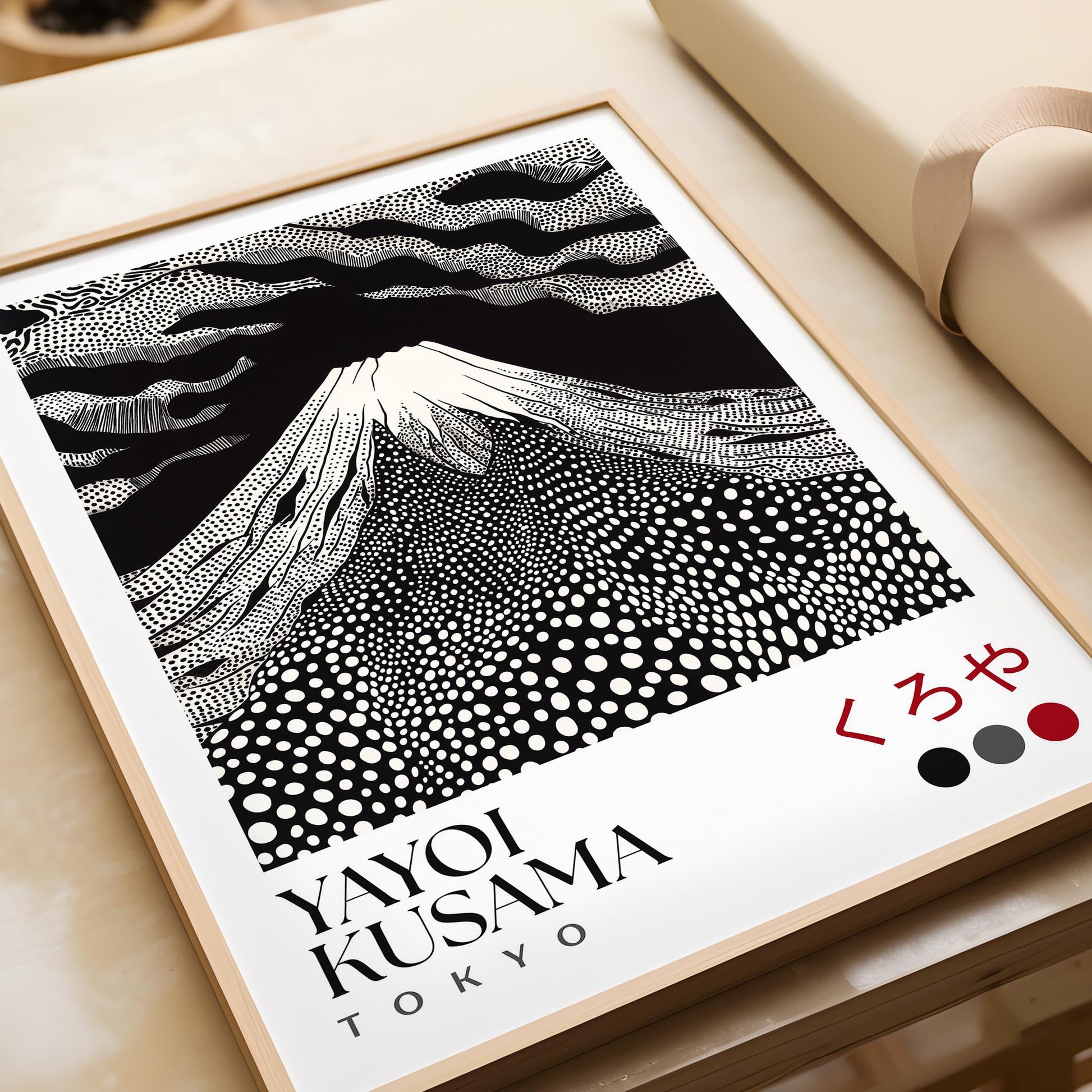 Striking Japanese wall art featuring Mount Fuji in bold black and white. This Yayoi Kusama inspired print reimagines the iconic mountain through dramatic contrast and her signature polka dot patterns, with textured clouds swirling above and dotted fields stretching below. The graphic, almost woodblock print quality creates a powerful minimalist statement, perfect for living rooms, offices, or any modern space seeking sophisticated Japanese artistry with timeless monochrome elegance.
