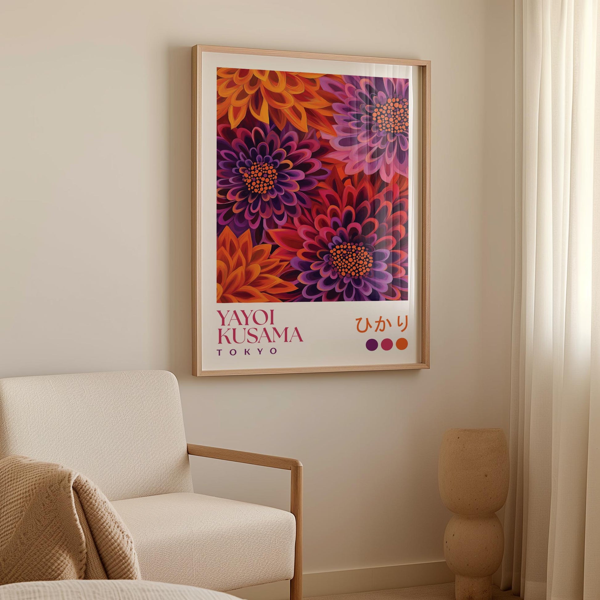 Bold Japanese wall art featuring magnificent dahlias in rich jewel tones. This Yayoi Kusama inspired print showcases dramatic blooms with layered petals in deep purple, fiery orange, and vibrant magenta, their centres dotted with her signature polka dot pattern. The sumptuous colours overlap and intertwine against a warm burgundy background, creating an opulent floral display perfect for living rooms, bedrooms, or any space seeking luxurious botanical drama.