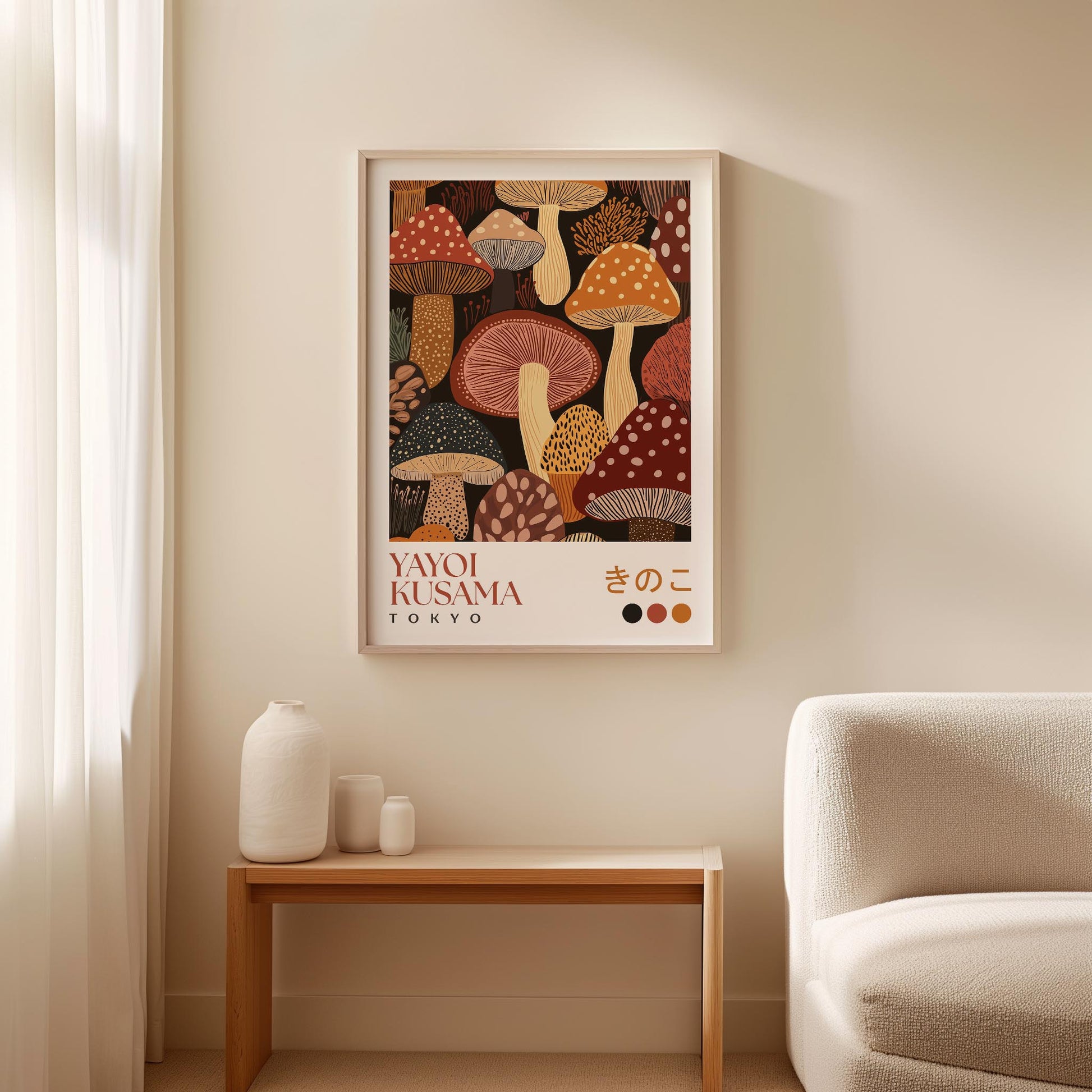 Bold Japanese wall art featuring an enchanting variety of mushrooms in warm autumn tones. This Yayoi Kusama inspired print brings her iconic polka dot patterns to a whimsical forest scene, with rich browns, burnt oranges, and earthy reds against a dark background. A striking piece that adds warmth and artistic character to living rooms, bedrooms, or any space celebrating nature and modern Japanese art.